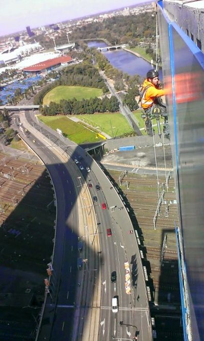 Oliver working on the Phoenix apartments, Melbourne in 2014 whilst employed as an IRATA tech.